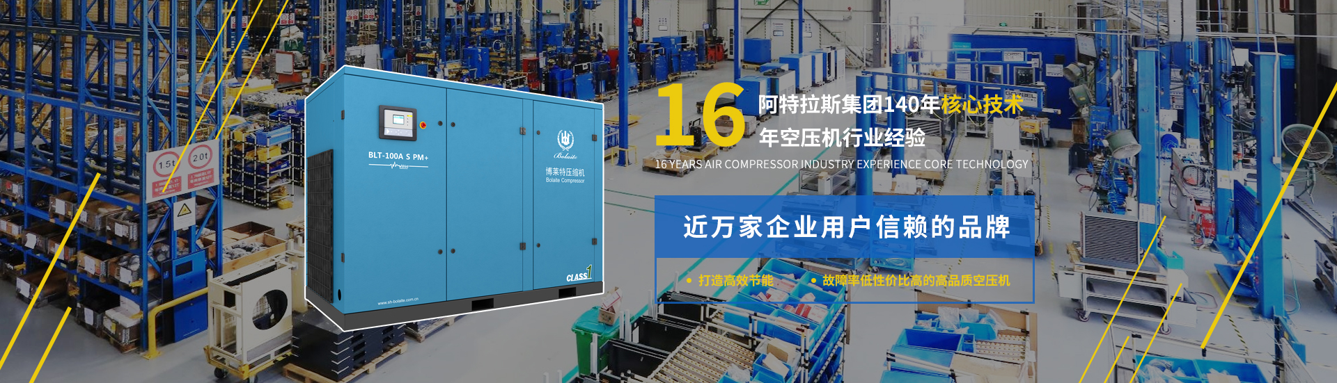 自1999年成立之日起,博萊特專(zhuān)注于螺桿式空氣壓縮機(jī)的設(shè)計(jì)、生產(chǎn)和銷(xiāo)售,以持續(xù)的技術(shù)創(chuàng)新和高品質(zhì)的產(chǎn)品、服務(wù)。2006年,博萊特被全球頂尖空壓機(jī)供應(yīng)商阿特拉斯·科普柯集團(tuán)全資收購(gòu),在集團(tuán)公司的支持下,現(xiàn)已成為中國(guó)空氣壓縮機(jī)行業(yè)的馳名品牌。承襲集團(tuán)先進(jìn)的技術(shù)、設(shè)備及生產(chǎn)管理模式,博萊特廣受贊譽(yù),并被廣泛應(yīng)用于機(jī)械、鋼鐵、礦山、化工、紡織、汽車(chē)、環(huán)保、新科技能源等多個(gè)領(lǐng)域。 ... [查看更多]